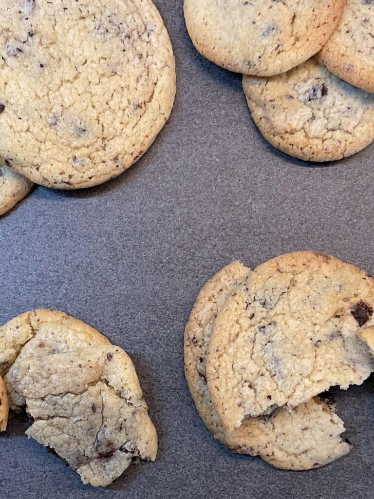 Die Cookies sind innen weich, umgeben von einem knusprigen, leicht karamellisierten Äusseren.