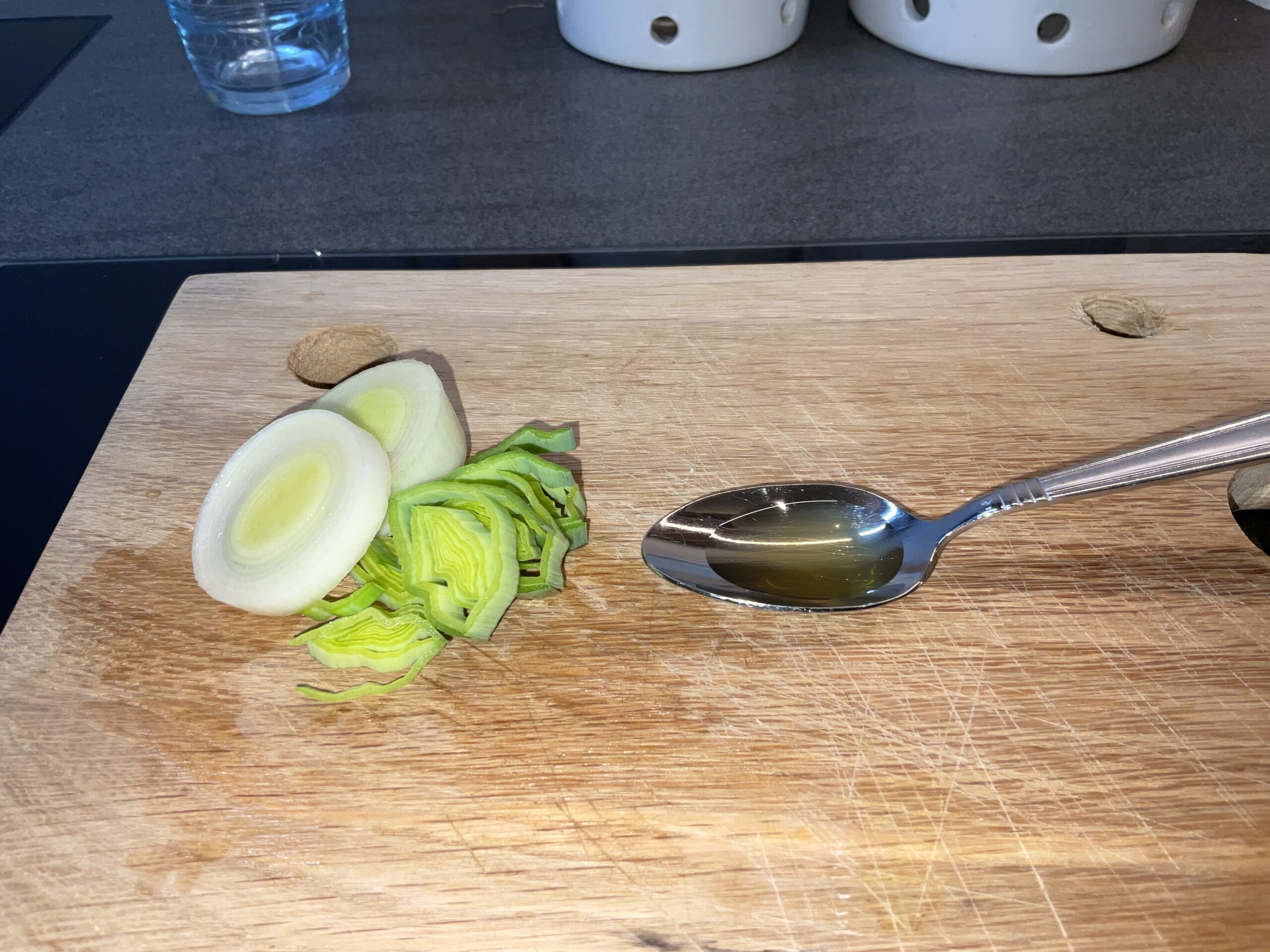 Den Lauch in feine Scheiben schneiden und in heissem Öl für ca. 5 Minuten glasig dünsten