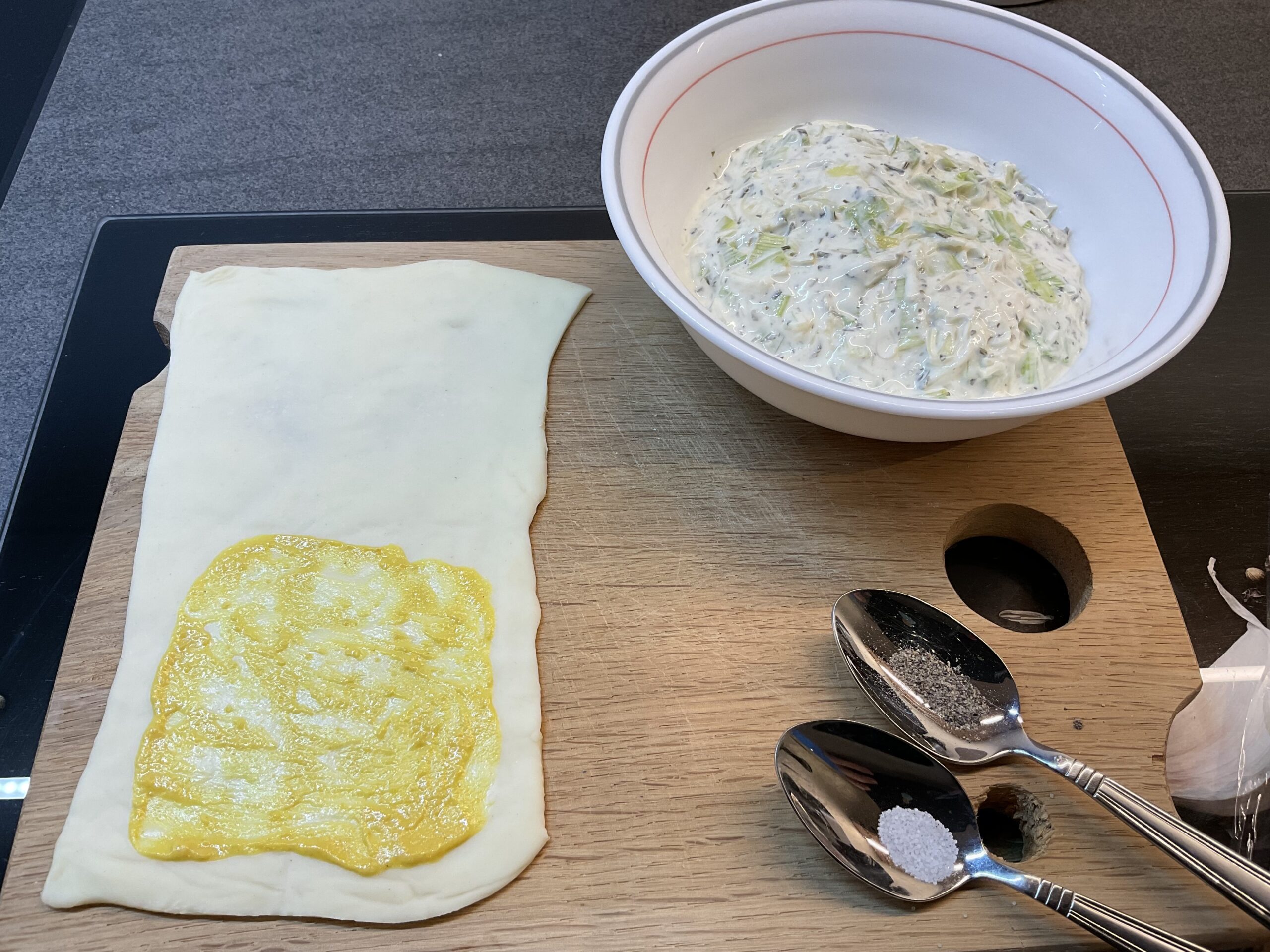 Die Füllung auf dem Senf verteilen und den Teig umklappen