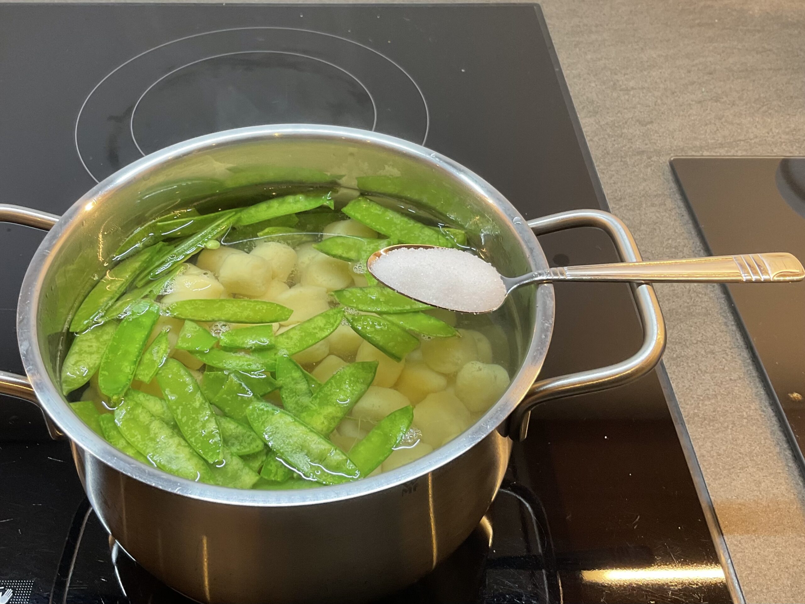 Das Wasser aufkochen, salzen, Gnocchi und Kefen hinzufügen und kochen lassen