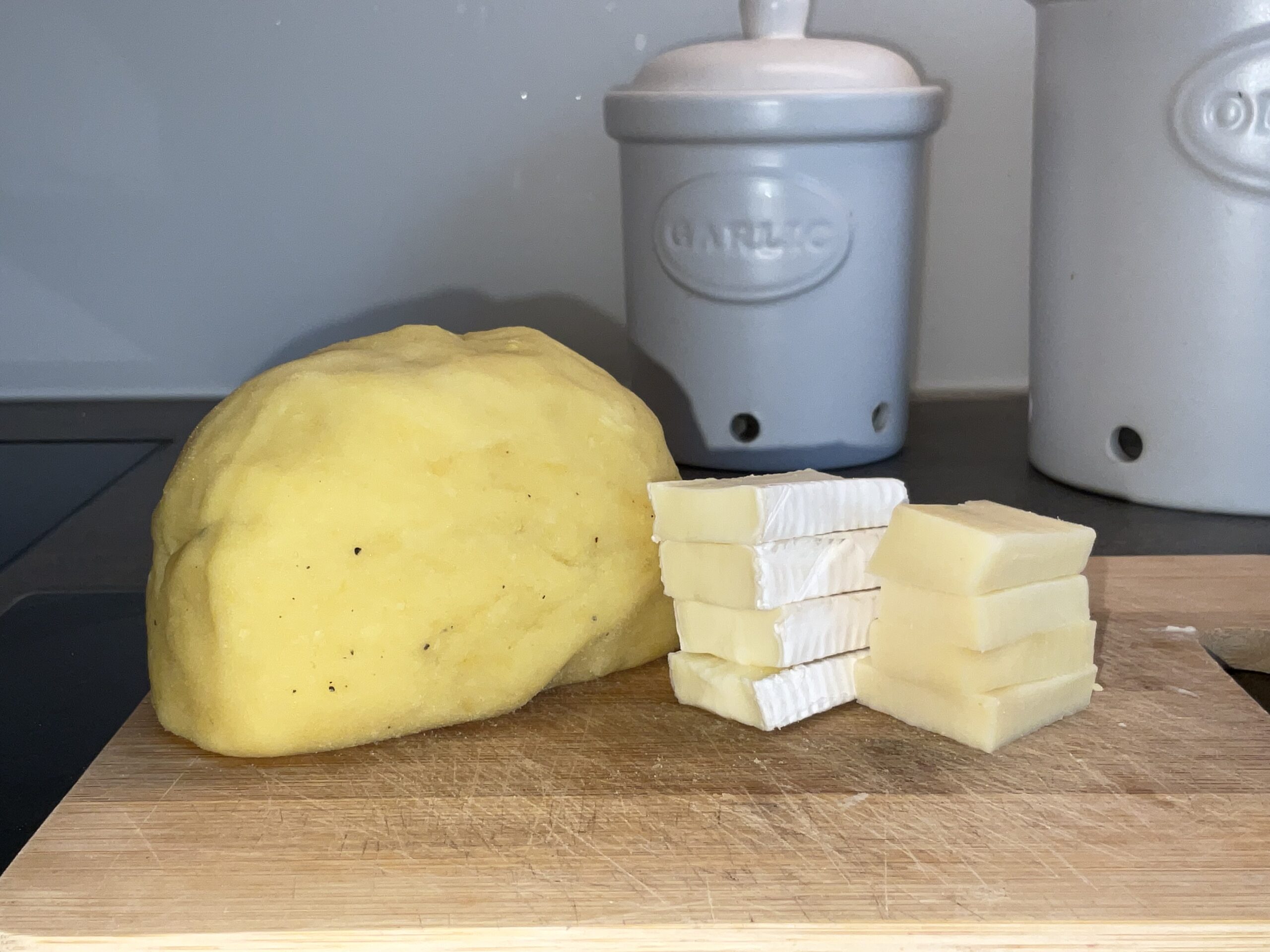 Den Kartoffelteig in 8 gleich grosse Stücke teilen, den Käse in 8 Scheiben schneiden.