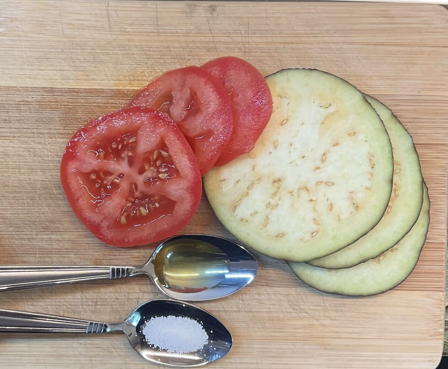 Die Auberginenscheiben zusammen mit den Tomatenscheiben in Öl anbraten und Salzen