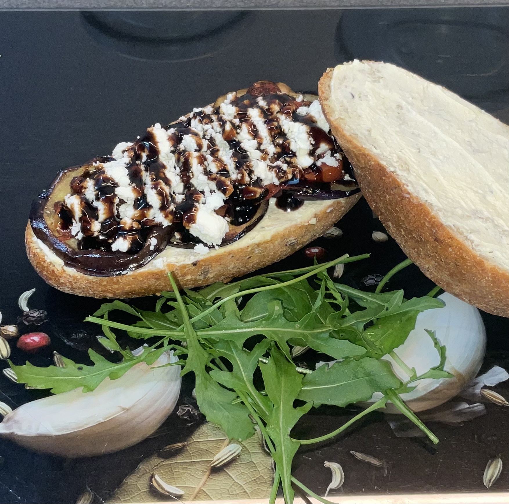 Die weichen Auberginen- und Tomatenscheiben auf dem Brötchen verteilen und den Rucola darauflegen sowie den restlichen Feta verteilen