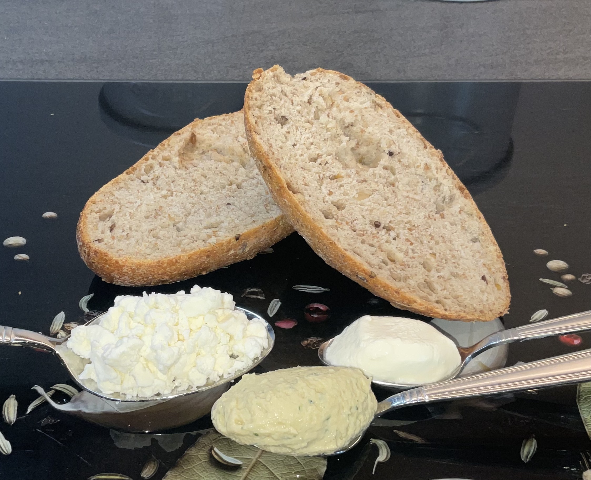 (die andere Hälfte kommt auf das Gemüse. Damit die Fetabrösel nicht aus dem Sandwich fallen müssen sie kleben an Frischkäse und Humus)