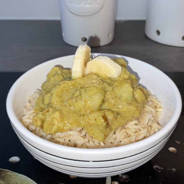 Den Reis ableeren und die Currysauce dazugeben, gut mischen und optional abschmecken mit mehr Salz oder Curry
