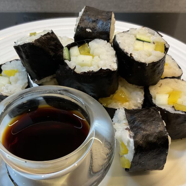 Die Rollen in Scheiben schneiden und mit Soyasauce essen